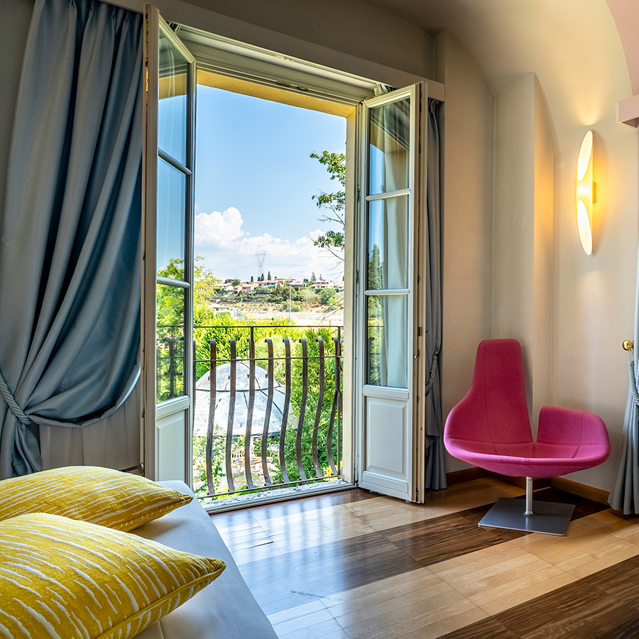 La Suite dispone di un elegante angolo salotto affacciato sui vigneti della Valpolicella, sul parco e sulla piscina, regalando uno sguardo privilegiato sul paesaggio circostante.