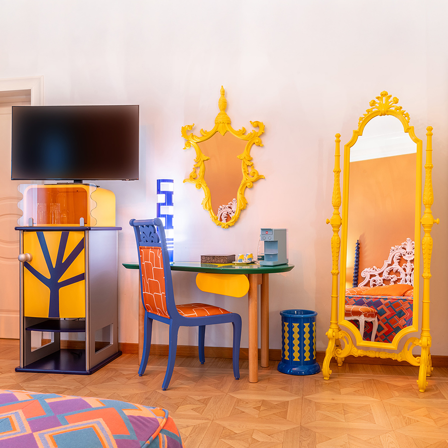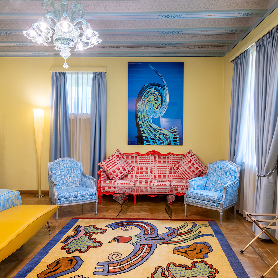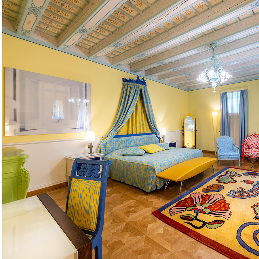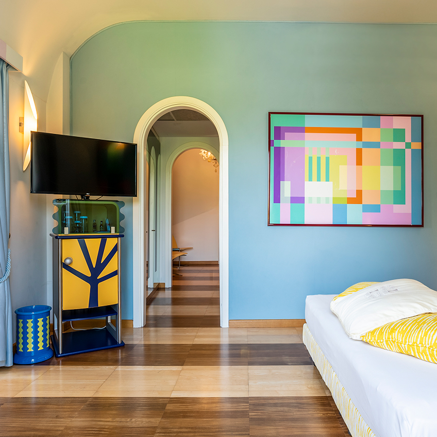 Collocata in una delle antiche torri colombaie che fronteggiano la villa, la Concept Suite Mendini’s Optical è un universo visivo in 37m², dove il design prende vita in una composizione audace di colori, riflessi e geometrie.