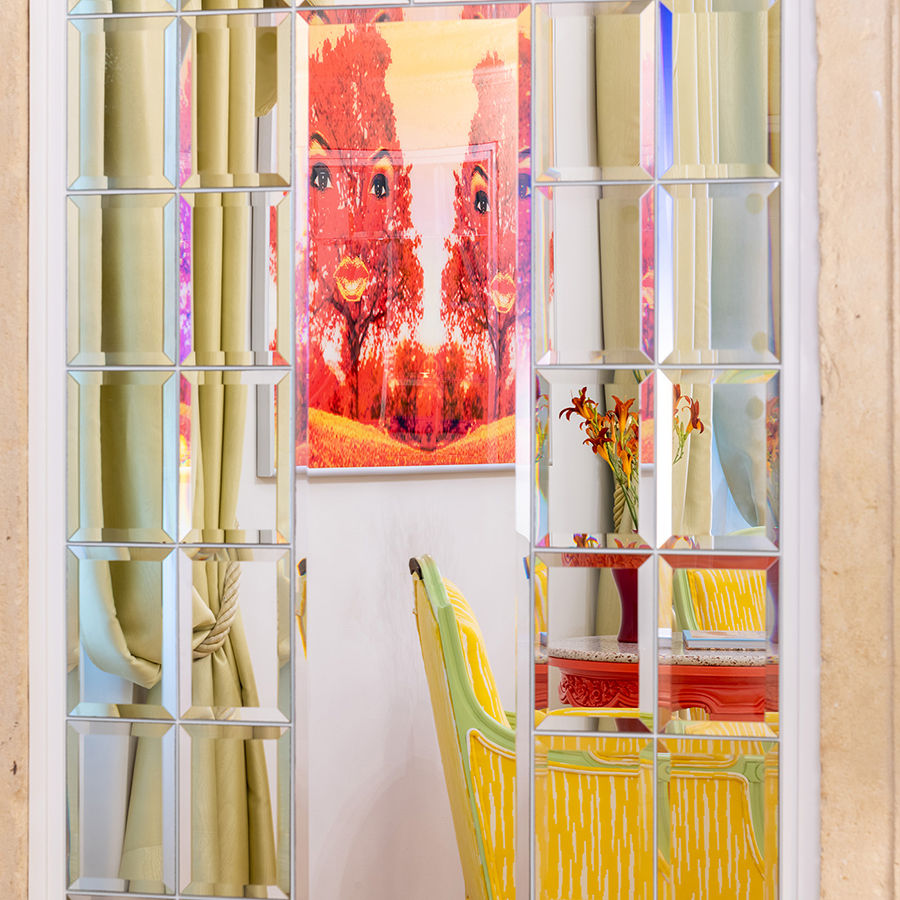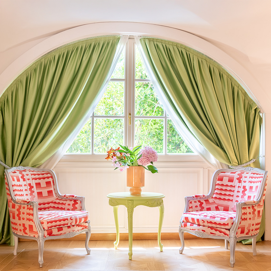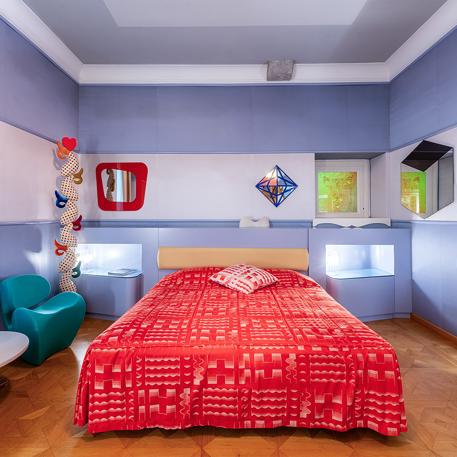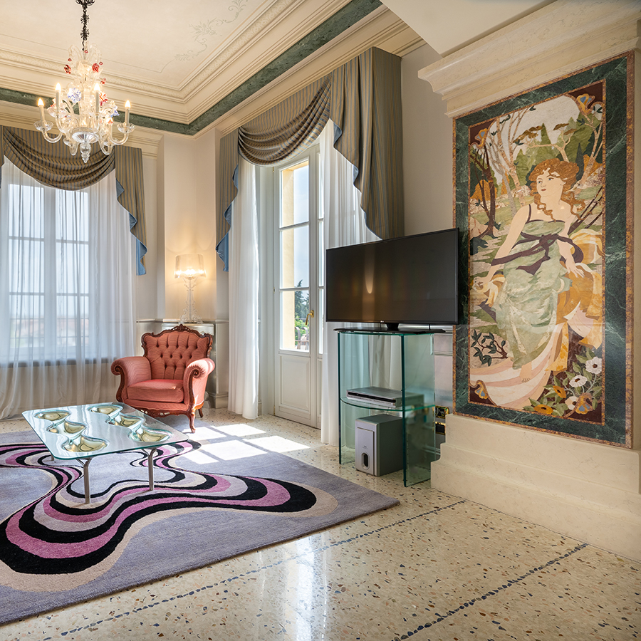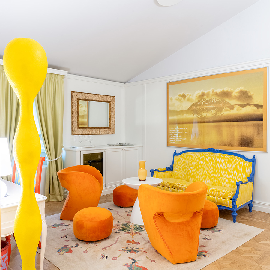 Collocata in una delle antiche torri colombaie che fronteggiano la villa, la Concept Suite Mendini’s Optical è un universo visivo in 37m², dove il design prende vita in una composizione audace di colori, riflessi e geometrie.