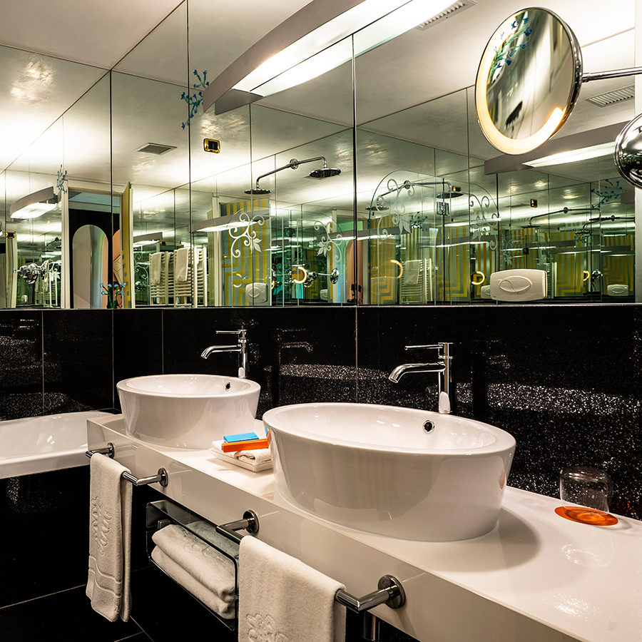 Gli interni sono un gioco di forme e luce, in cui ogni oggetto ha una voce. Il bagno è rivestito in mosaico, con lavabi in cristallo e vasca scultorea. A completare l’esperienza: macchina da caffè espresso con capsule, minibar disegnato da Anna Gili, Smart TV Samsung con sistema LYNK Cloud, canali Sky e satellitari, aria condizionata, cassaforte.