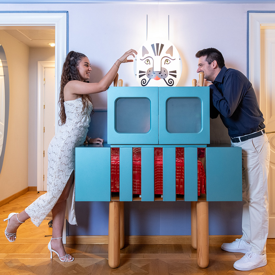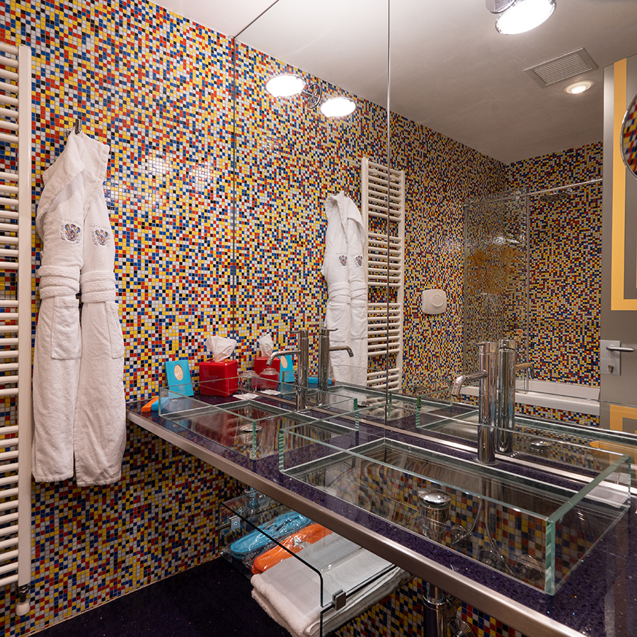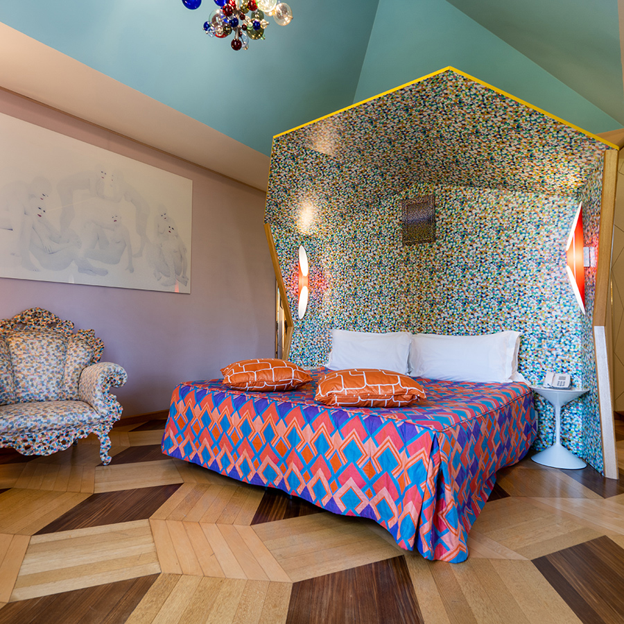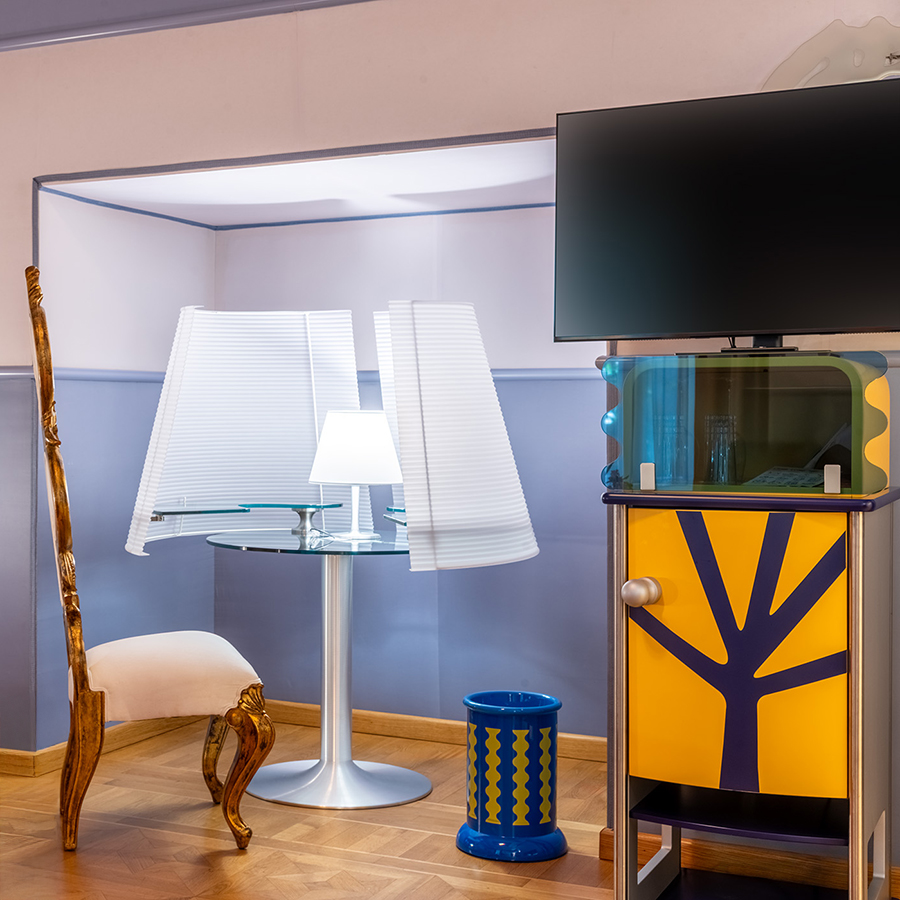 Firmata dall’Atelier Mendini, la Concept Suite Mendini’s Island è una vera celebrazione del pensiero progettuale di Alessandro Mendini. I suoi 42m² accolgono arredi iconici realizzati dallo stesso architetto, in dialogo con pezzi originali di Ron Arad e Philippe Starck, per un’atmosfera eclettica e profondamente contemporanea.