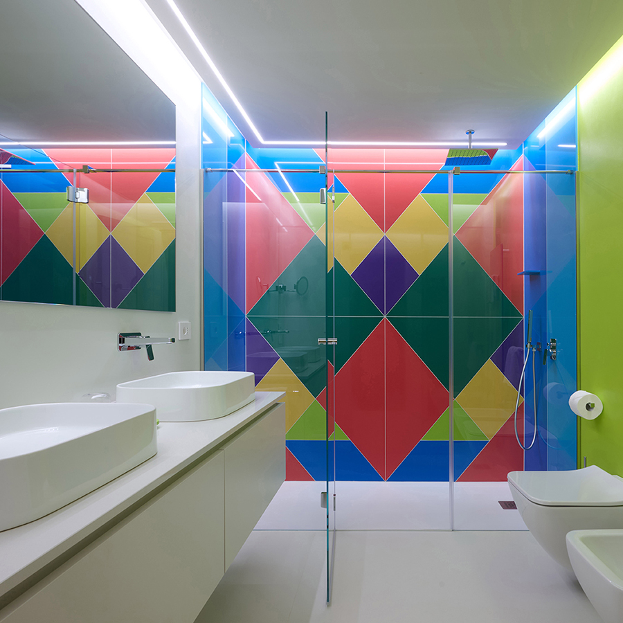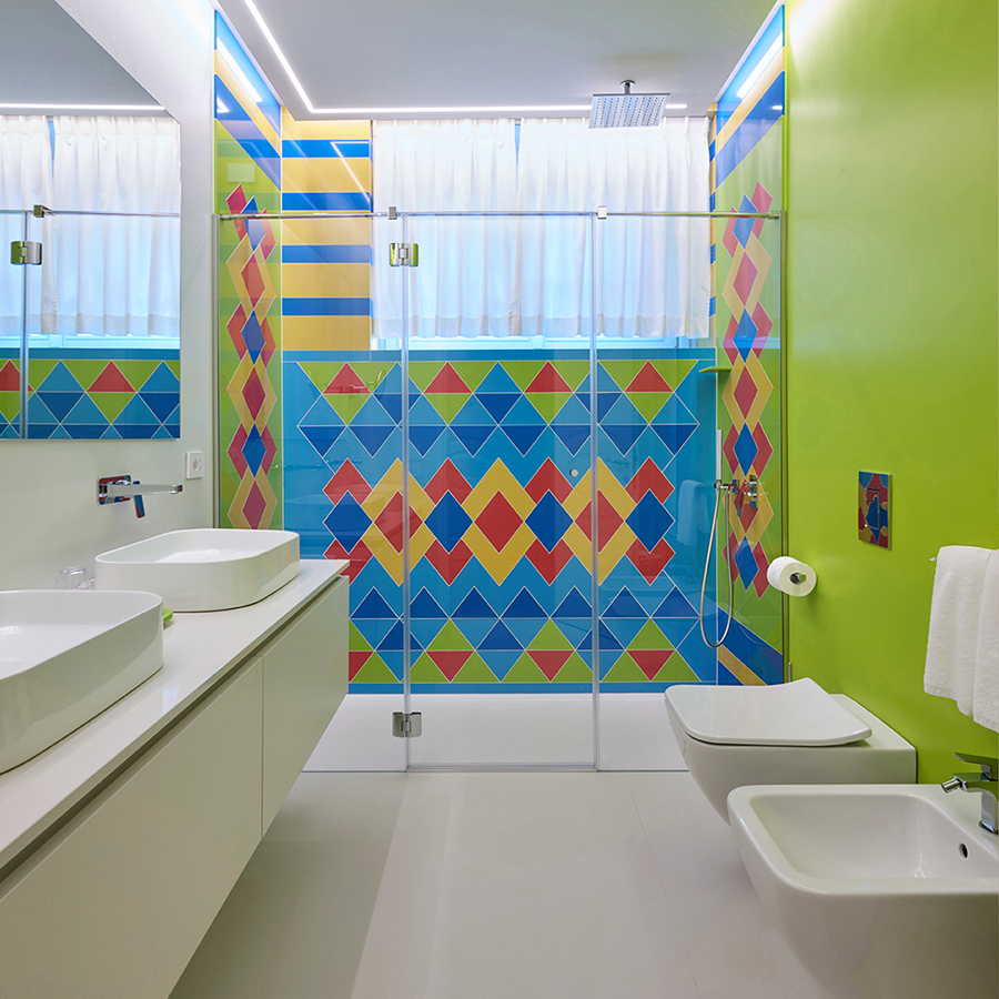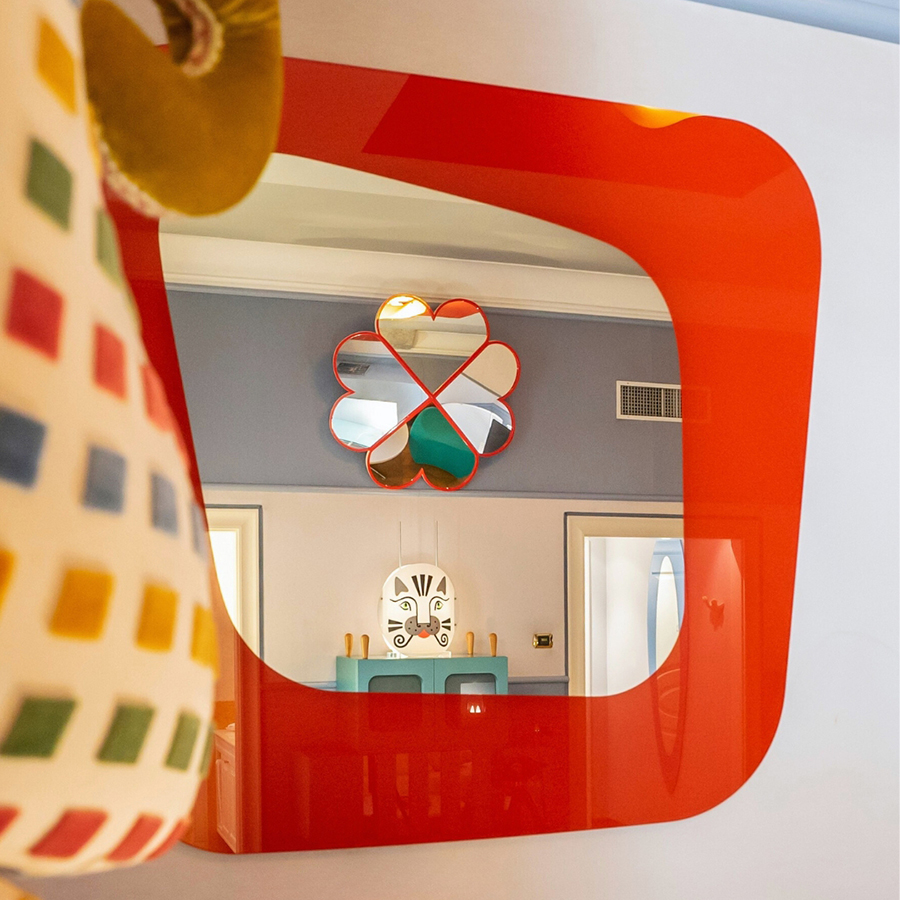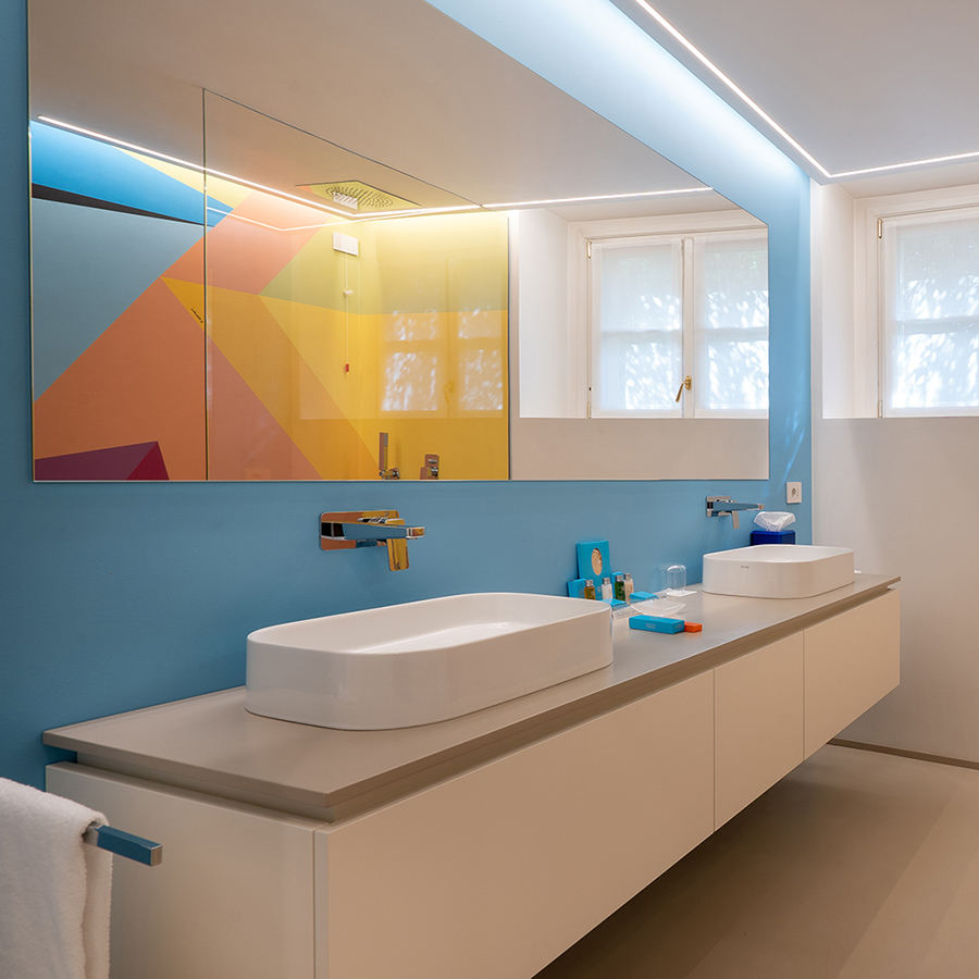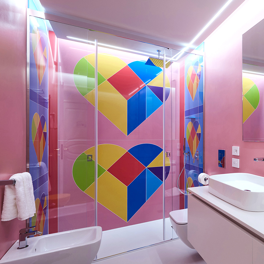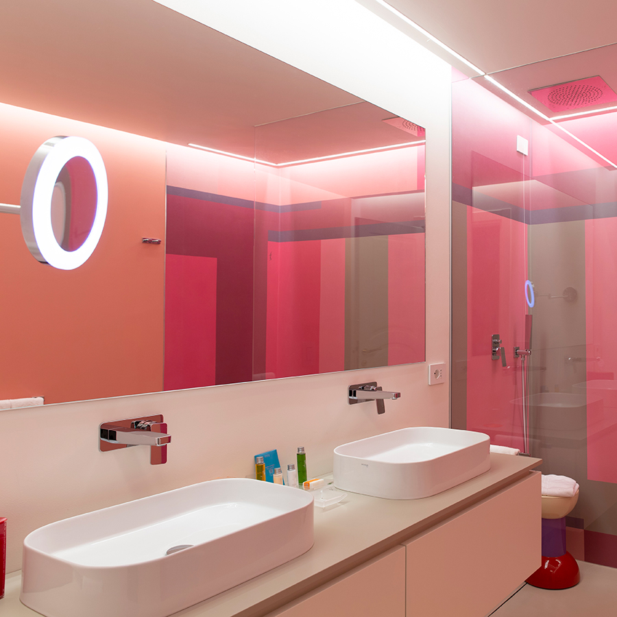 Le pareti a righe lilla orizzontali si intrecciano con un soffitto rosso vivido, creando un effetto scenografico che trasforma lo spazio in una tela tridimensionale. Sei specchi d’autore, firmati da designer differenti, amplificano le prospettive. A impreziosire l’ambiente: un mosaico su vetro, una sedia scultura di Carla Tolomeo e il caratteristico minibar firmato Anna Gili.