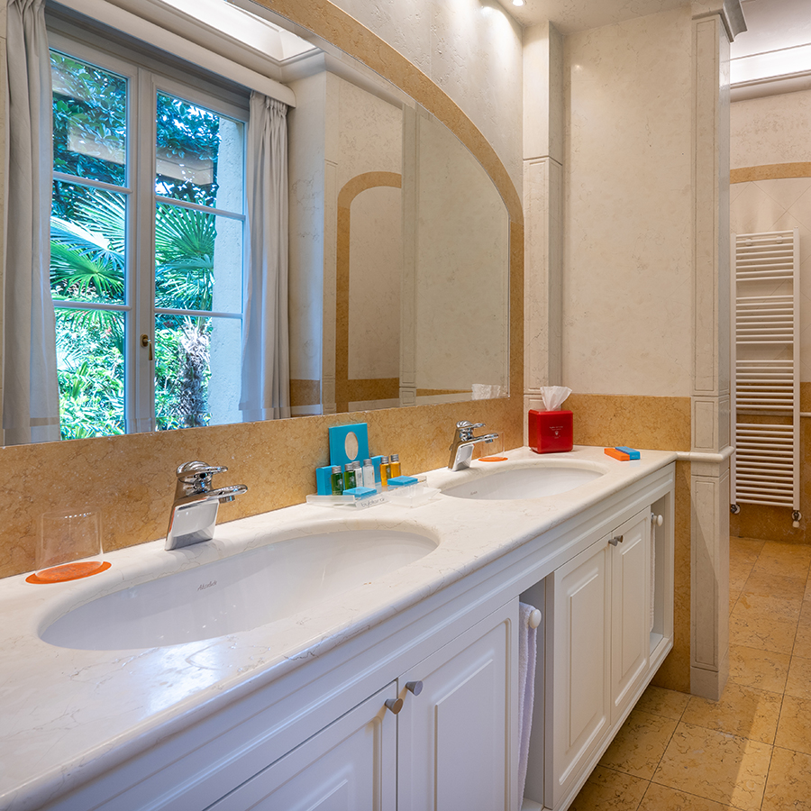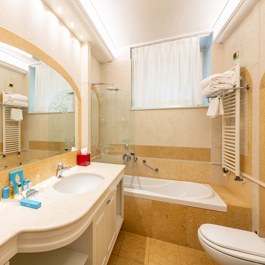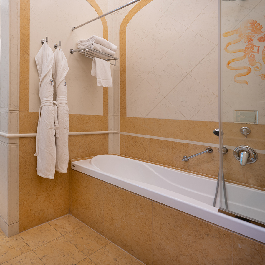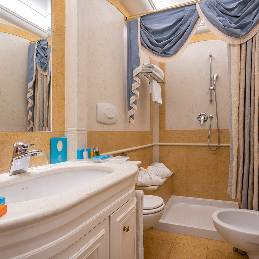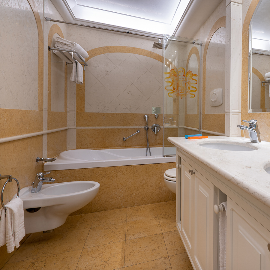 I bagni in marmo sono dotati sia di vasca con doccia che di doccia separata.